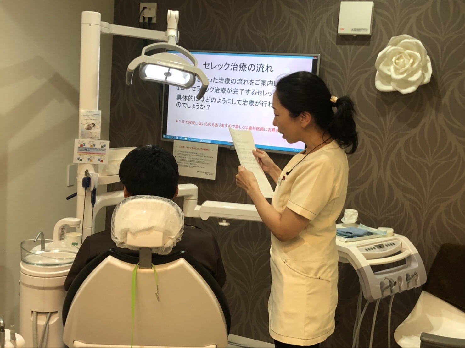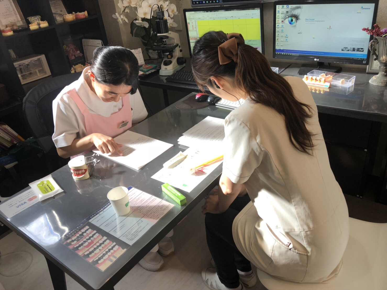 診療前に当院では治療の効果を最大限に引き出すために、poicウォーターによる徹底洗口をして頂いています。今回はその流れとシステムを理解するために、スタッフ間の相互実習も行いました。