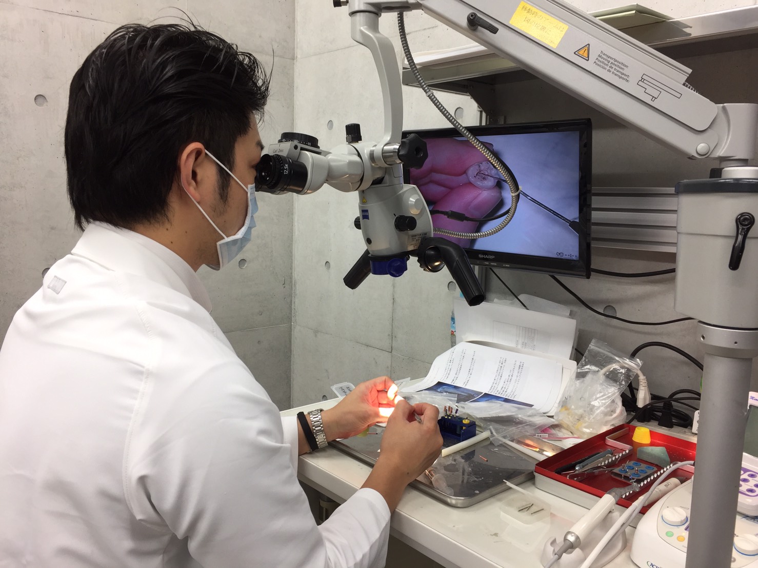 しかし、土曜、日曜と歯の神経の治療の成功率を上げ、患者さんに笑顔でいてもらうために、マイクロスコープとNITIファイルを用いた実習の勉強会に出席しました。