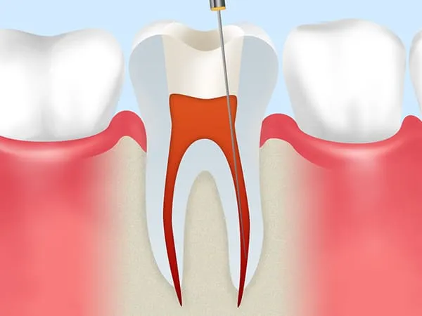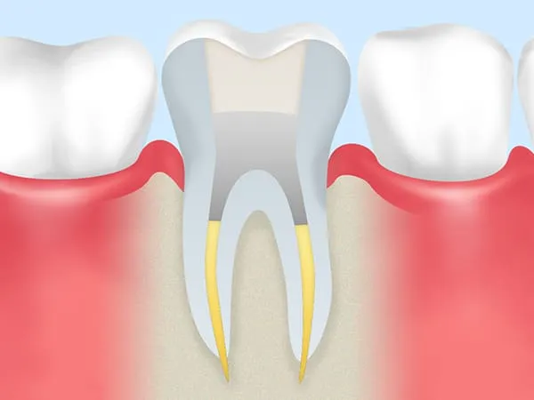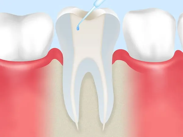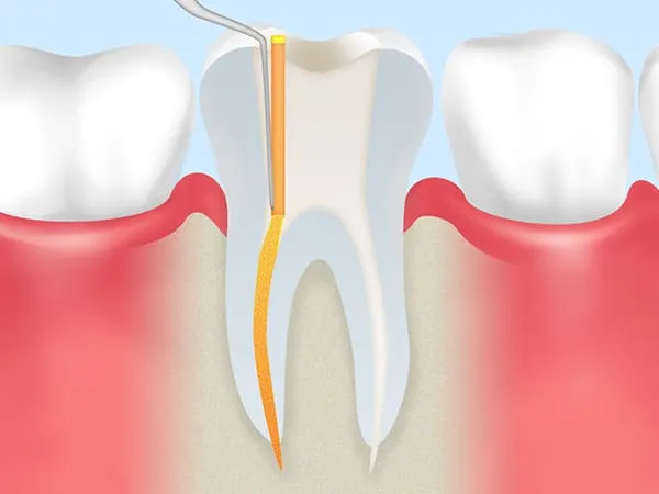 根管治療とは、虫歯菌に汚染された歯の中の神経を除去し、神経が入っていた細い管「根管」の中を洗浄・消毒してからすき間なく薬剤で埋めて密閉する処置です。その上に、支台を立て、被せ物を装着して歯の機能を補います。