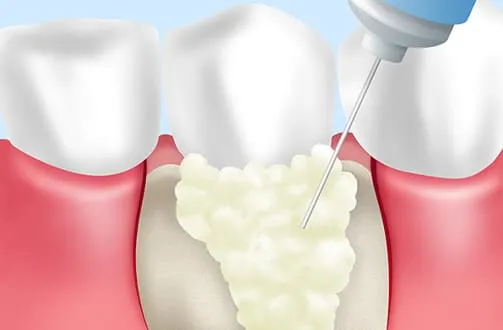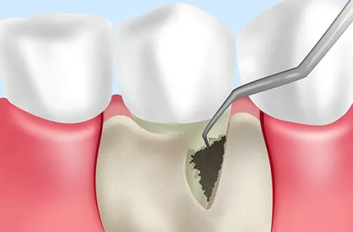局部麻酔を施したあと、歯ぐきを切開し歯根を露出させ、こびりついたプラークや歯石、また歯周病菌に感染した組織を除去します。